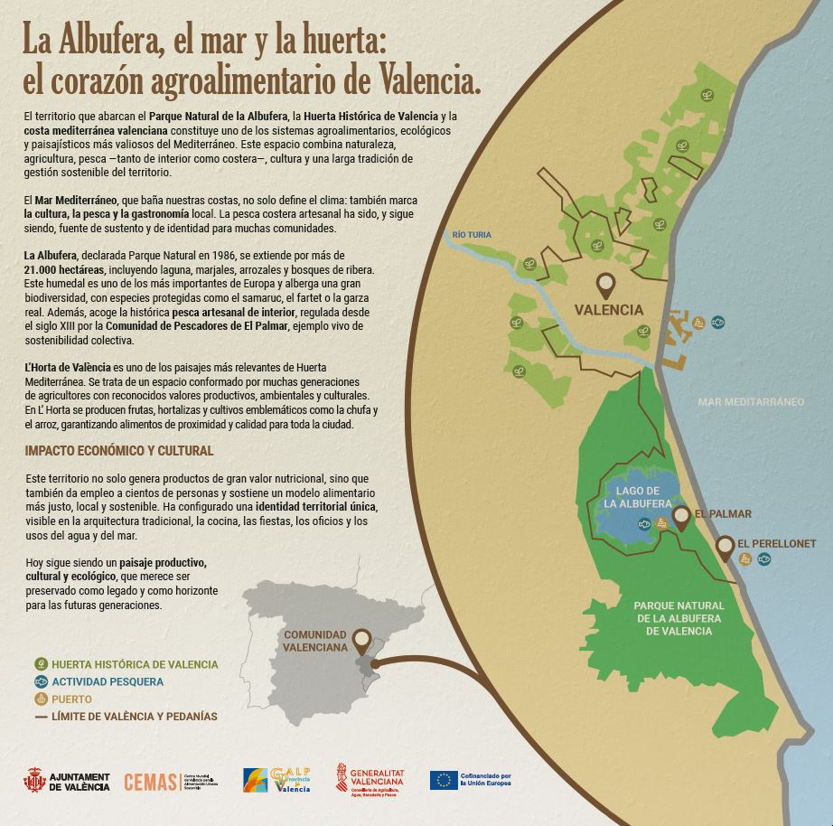 El proyecto se desarrollará en la Ciudad de Valencia, con un ámbito de actuación que incluye tanto el núcleo urbano como sus pedanías y zonas periurbanas. Esta localización es estratégica, ya que concentra una rica tradición agrícola y pesquera que se busca poner en valor mediante las acciones previstas.